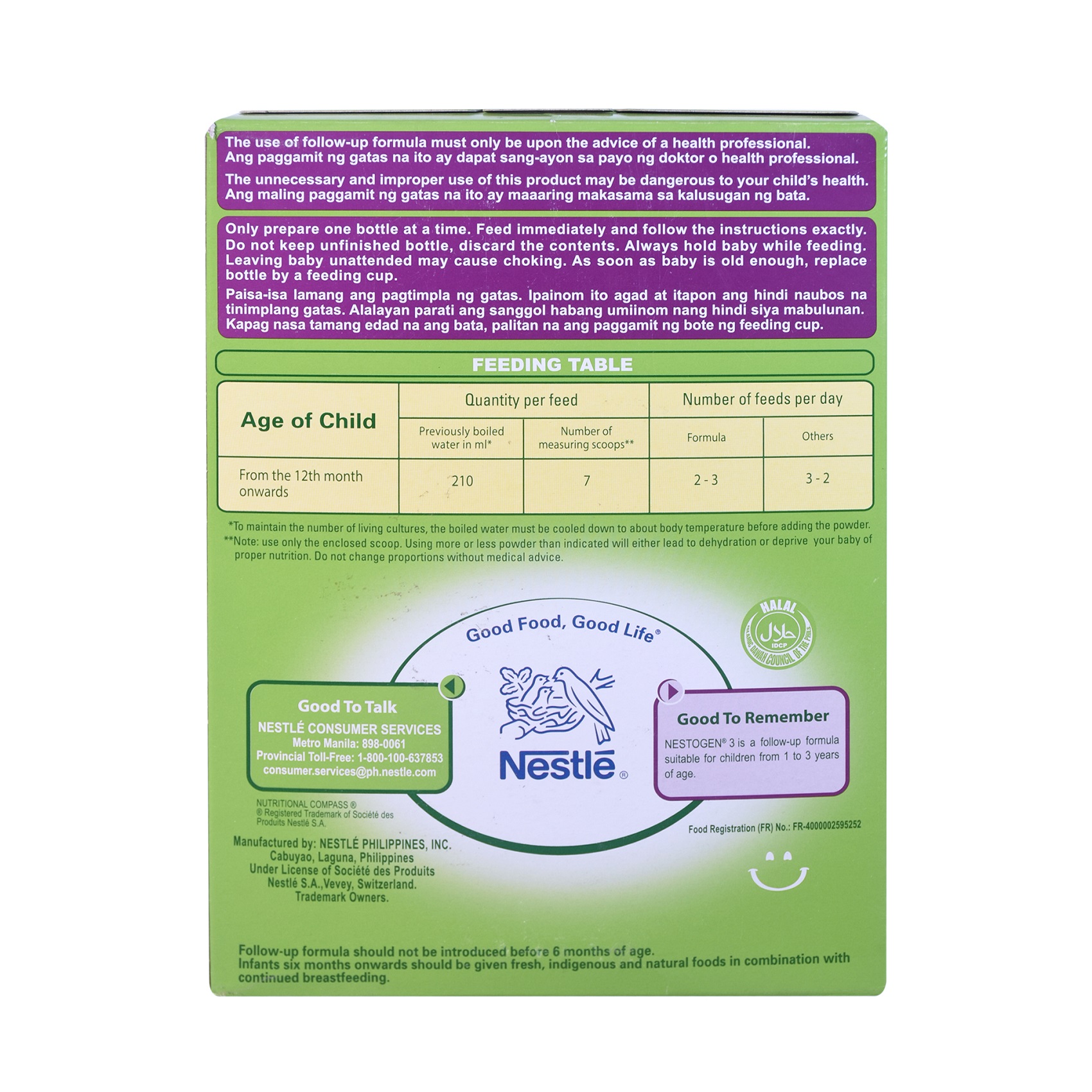 Nestogen 3 is a growing up milk designed for toddlers from 12 months and above as the liquid part of the diet it is intended to replace cow s milk Nestle Nestogen 3 is enriched with special ingredients that are rich in iron for the growth of your baby This milk formula is also fortified with calcium to make your baby s bones strong The
