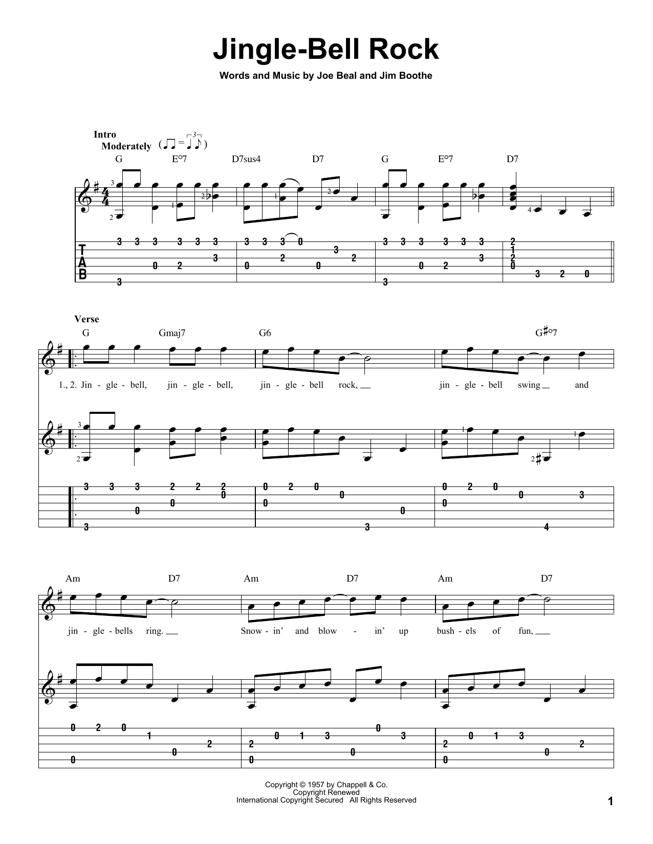 I dout that this is the most advanced version of the ones out there but it is the simplest to play by far and it sounds pretty good to me hope you enjoy Jingle bell Rock D Jingle Bell Jingle Bell Jingle Bell rock D Em A Jingle Bells swing and jingle bells ring Em A Em A Snowin and blowin up bushels of fun E A Now the jingle hop has begun D Jingle Bell Jingle Bell Jingle Bell rock D Song Jingle Bell Rock Artist Bobby Helms 2011 Any use without permission is prohibited www TheGuitarLesson Jingle Bell Rock Guitar Tabs and Chords Hello there hope you enjoyed the video you ve got a lot of practice ahead of you It s all worth it though since Jingle Bell Rock is an ultimate Christmas tune which you ll love